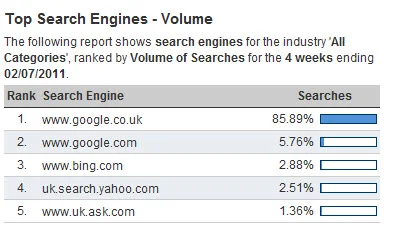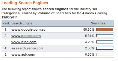 Updated 09 Jul 2011, Google leads the way with 65.5% share of the market place, followed by Yahoo (15.9%), Microsoft (14.1%), Ask (2.9%) and AOL (1.5%). For more information, please refer to the press release by comScore about Search Engine rankings.