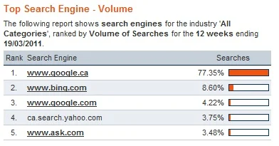 As shown in the picture above, Google commands 81.57% of the market share, Bing and Yahoo follow with 8.6% and 3.75% respectively. Updated 04 Apr 2011: The above data was taken from Hitwise, please refer to the top websites and search engines from Hitwise Canada.
