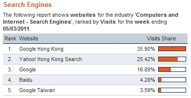 It's a very interesting case in Hong Kong. Yahoo used to own this market place in terms of Search engine market share. However, take a look at the data provided by Hitwise in Mar 2011