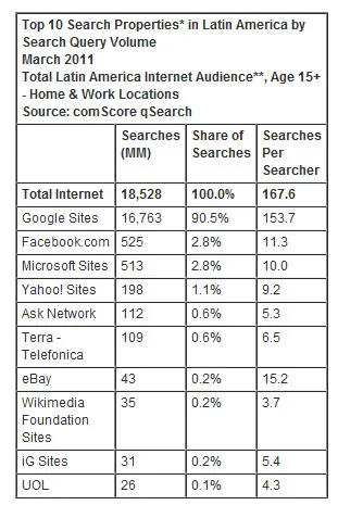 Update May 17th, 2011: According to comScore, Google has 90.5% of the market share in Latin America. In this study, Latin America includes the following countries: