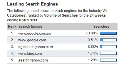 Yahoo and Bing are behind with combined search market share of only 13.41% Local search engines are insignificant in Singapore, which is already too small for Google, Yahoo or Bing.