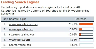 Google solidifies its position with 86.51% of the market share, followed by Yahoo and Bing. Updated Mar 2011: The battle between search engines was over in Singapore in 2010. Google now has 84% of the market place.