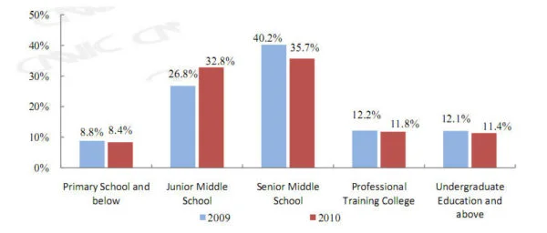 - As for educational background, this is where i think China has lots to do to catch up with other countries. The majority of internet users (78%) do not have undergraduate degree or even high school degree. This is important because that means the majority of Chinese net citizens seem to belong to the lower middle class income group.
