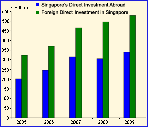 Foreign direct investment in Singapore for 2009 past 500 billion Singapore dollars, nearly two times the GDP level of Singapore! This is quite a big number considering the size of Singapore is just like a city.