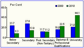 As you can see from the graph above, in 2010 the percentage of Singapore resident with secondary or higher qualification is about 91.7%. Especially those with university degree are at 44.1%. This is quite high if we compare with other countries in the region.