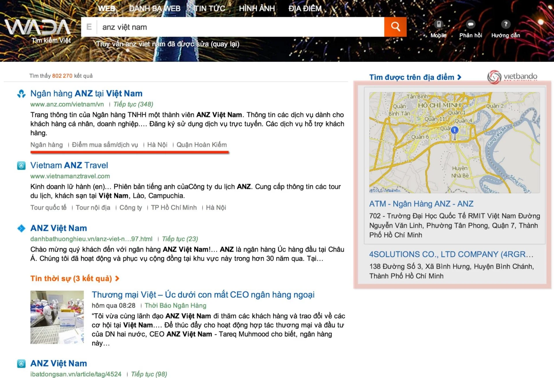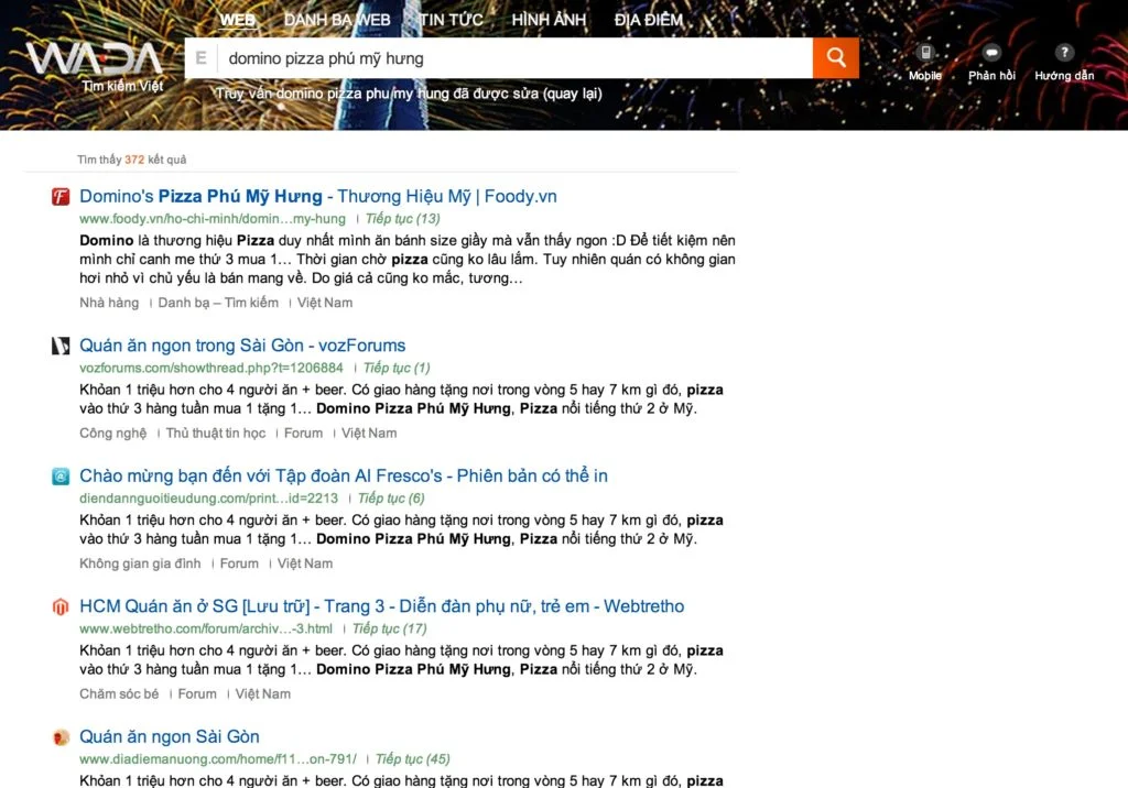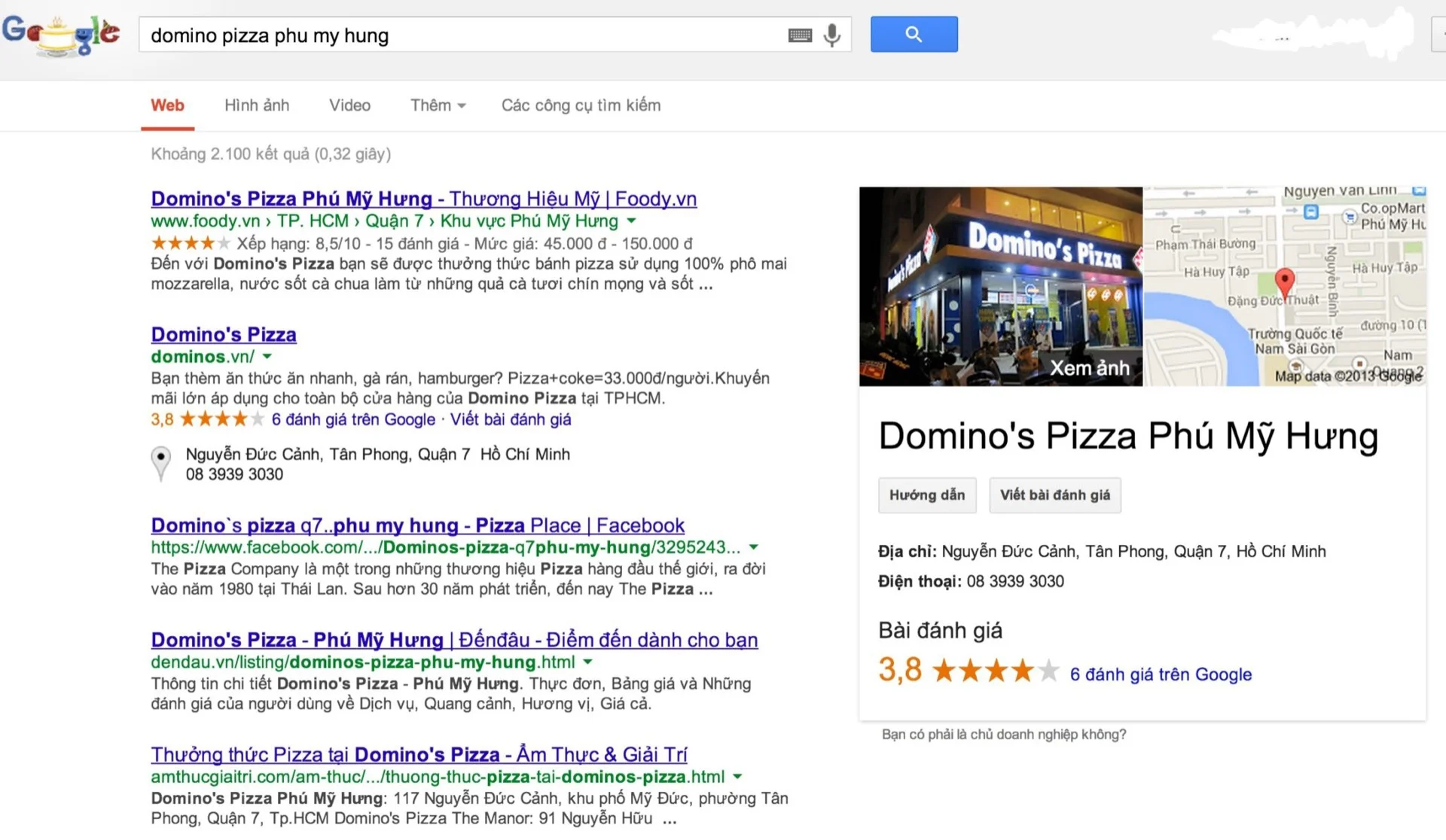The first result is good. It even has a few sitelinks at the bottom which is not bad. Results 2, 3 and others are not good. They shouldn't be in the first page in my opinion. Under the map listing on the right hand side, there is a very strange link "4SOLUTIONS CO., LTD COMPANY (4RGR". I have no idea what it is and how it is relevant to what I am looking for when I type in "ANZ Viet Nam". Next, let's try "domino pizza phu my hung", which is the equivalent of "pizzahut le thanh ton" in the last post. This is the result from Wada: