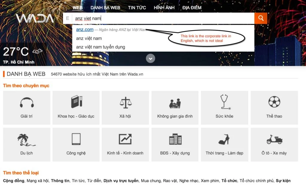 Last time, I used "HSBC Vietnam" so this time, I use "ANZ Vietnam", which is kinda equivalent. The auto complete function appears as usual. However, the suggested link is not good.