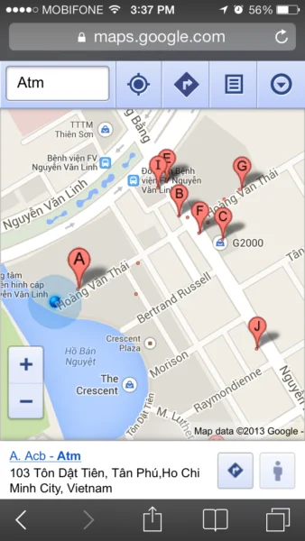 FYI: I am at "Coffee Bean and Tea Leaf" at Cresent Mall, District 7 when I capture these screenshots. For strategic reason I assume, Wada uses Vietbando map data, which in my opinion is not ideal. The data is old, and not accurate. I can't even zoom in, or out correctly, or view listing number 3 or 4 in the list on the map even if I want to and click on them. I don't even see where I am on the map. There is no "direction function" with Vietbando. I know Maps is hard, even Apple doesn't get it right. The below is the result from Google Map, using on iOS, web version of course.