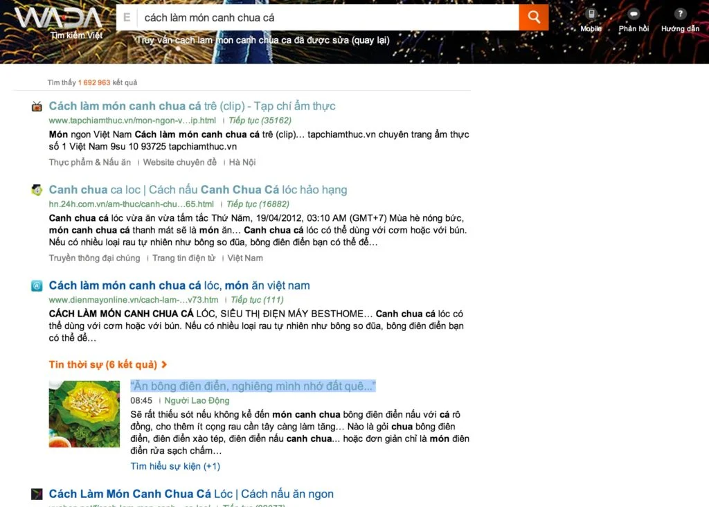Let's try to put in a couple of keywords to test Wada.vn as a generic search engine again and compare the results with June 2013.