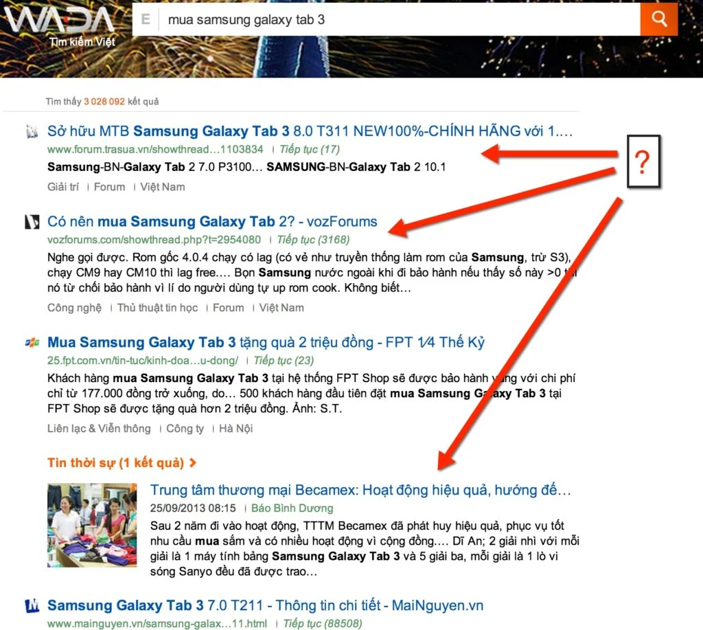 Since Lazada.vn and Wada.vn signed the official partnership agreement during the event, I want to see if Lazada receives any special treatment from Wada.vn when it comes to ecommerce queries so I try "buy samsung galaxy tab 3" which is one of the promotional items on Lazada.vn This is the result from Wada.vn for "mua samsung galaxy tab 3"