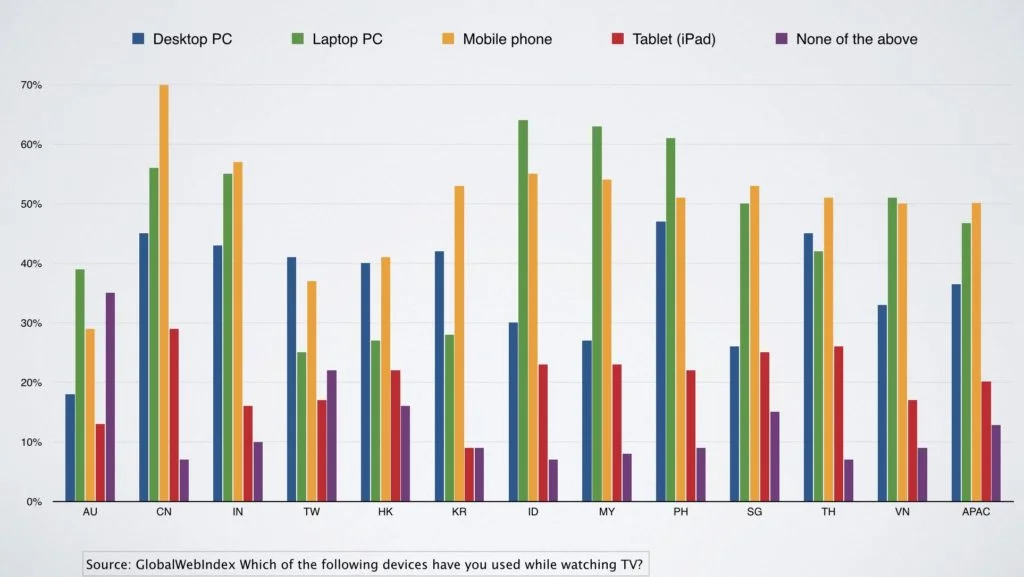 Source: GlobalWebIndex Countries like CN, HK are leading the region in terms of % of users who go online at least 1 hour per day via mobile. Nearly half of users in APAC use Mobile while watching TV as well. This brings us to the reality of a multiple-screen world.