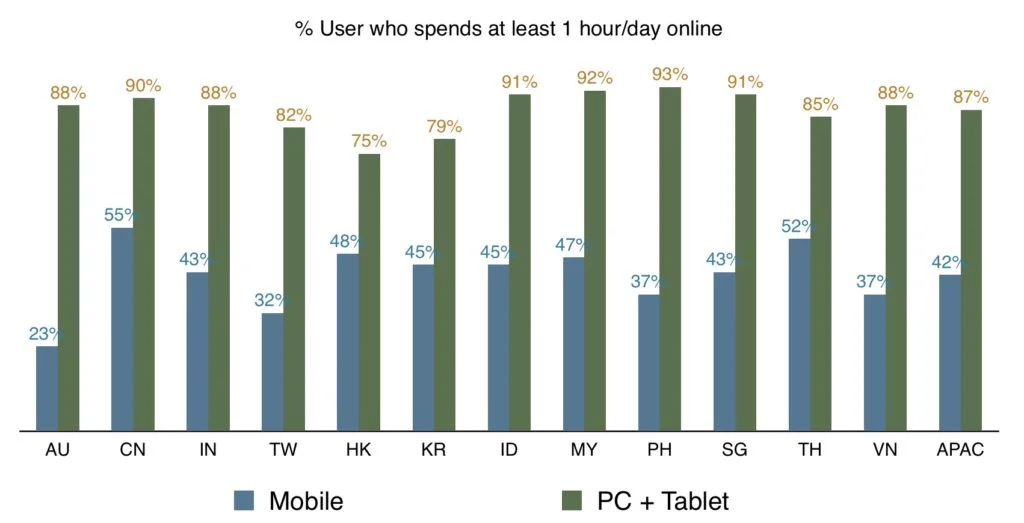 Of course across APAC, people would still spend more time on desktop/laptop. However time spent on mobile is increasing.