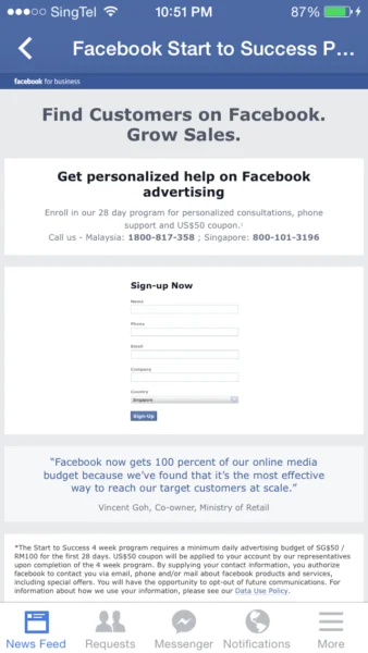 While I can see the "whole" landing page, the sign up form is so small that it's so hard for me to sign up. Also, it's clear that Facebook could target people based on geo location so please provide me with only one phone number that you want me to call, not two for different countries. You should know where I am as this is one of your unique selling points. I am not at all qualified to speak about user experience on mobile device but I guess my point is clear. I am curious to understand the conversion rate from click to sign up on Android and iOS for Facebook for Business ad. Also, may I suggest common sense and "less is more" for mobile landing pages? or may be some creative optimisation? I always see the same "lady" for the past two months. Cheers, Chandler