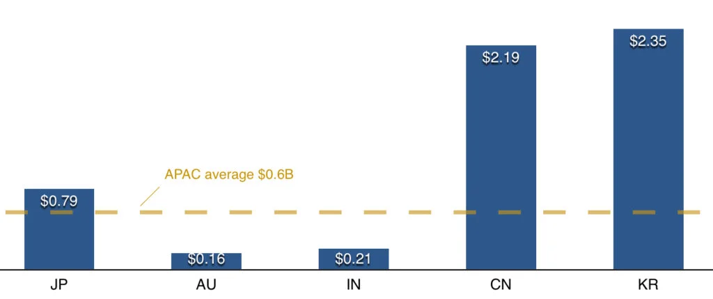 First of all, the use of the word "cost" is not accurate as I don't know how much winning brands spent on their respective campaigns. However, what I am after is trying to understand if it's true that the bigger markets in APAC in terms of media ad spend also bring in more awards? So a proxy that I could find is total media ad spend per market divided by the number of awards won. I got the media ad spend based on eMarkter "Global Media Intelligence Report 2014". The graph below shows the differences between main countries in billion US$.