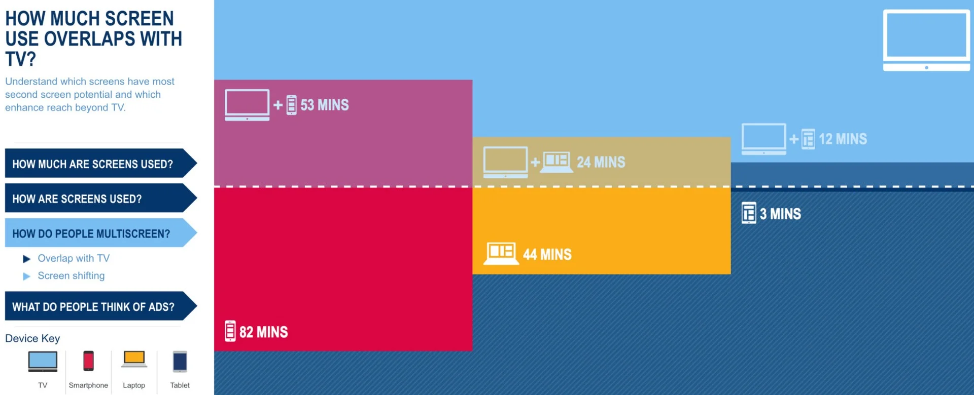 As expected, people switch between devices quite often, at about 35% use multiple devices at once. It looks like while people are watching TV, they use their smartphone at the same time, followed by laptop and tablets. In total out of 2 hours of TV usage per day, about 90 minutes of usage is overlapped with smartphone, laptop and tablet.