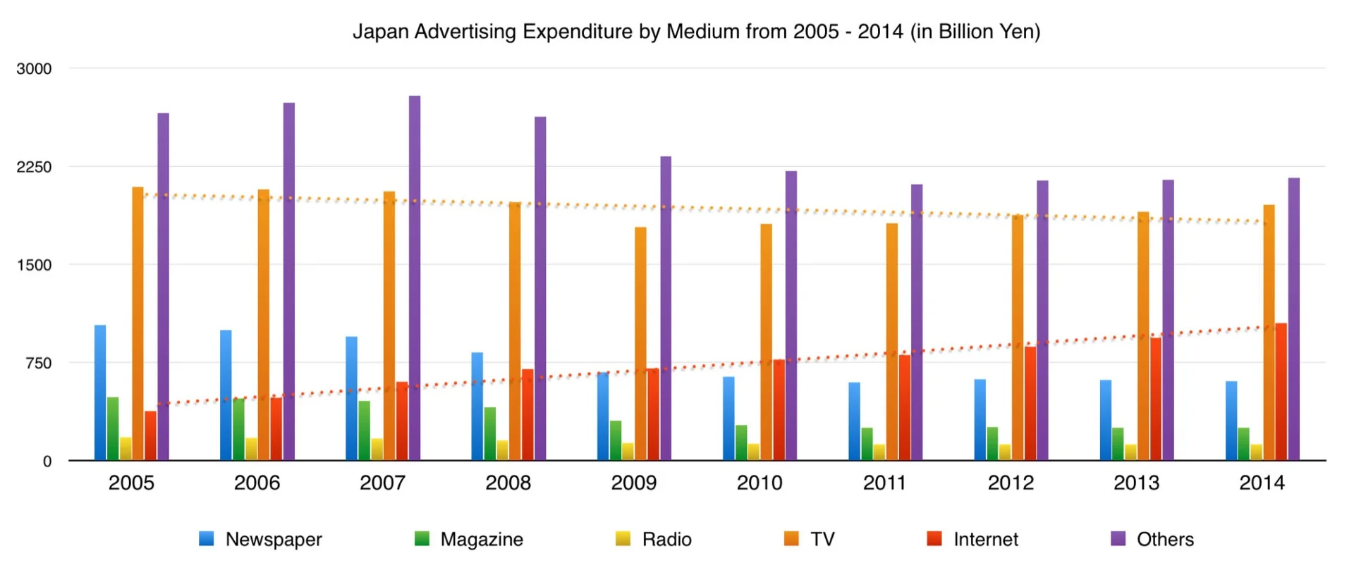 Dentsu (the biggest agency network in JP) publishes very detailed information about Japan Advertising Expenditures from 1999 until now. From the 2014 Japan advertising expenditure report, we could see the following information regarding the market share of TV, Magazine, Radio, Internet and other channels in Japan.