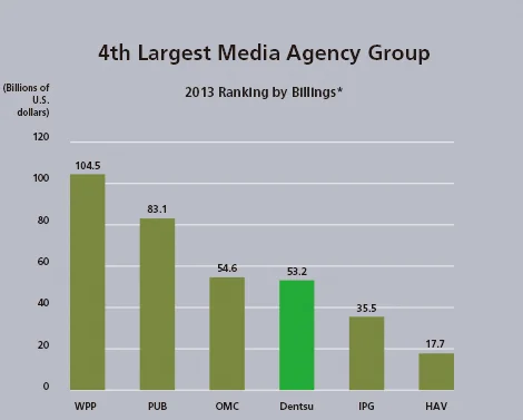 dentsu is the 4th largest media agency group globally[/caption] Since Dentsu Group’s media billings are a simple sum of Dentsu Aegis Network’s media billings and Dentsu’s non-consolidated media billings, one could guess that Dentsu Aegis Network's media billings was around US $28 billion in 2013. http://www.dentsu.com/ir/data/pdf/2015EAPREE1.pdf