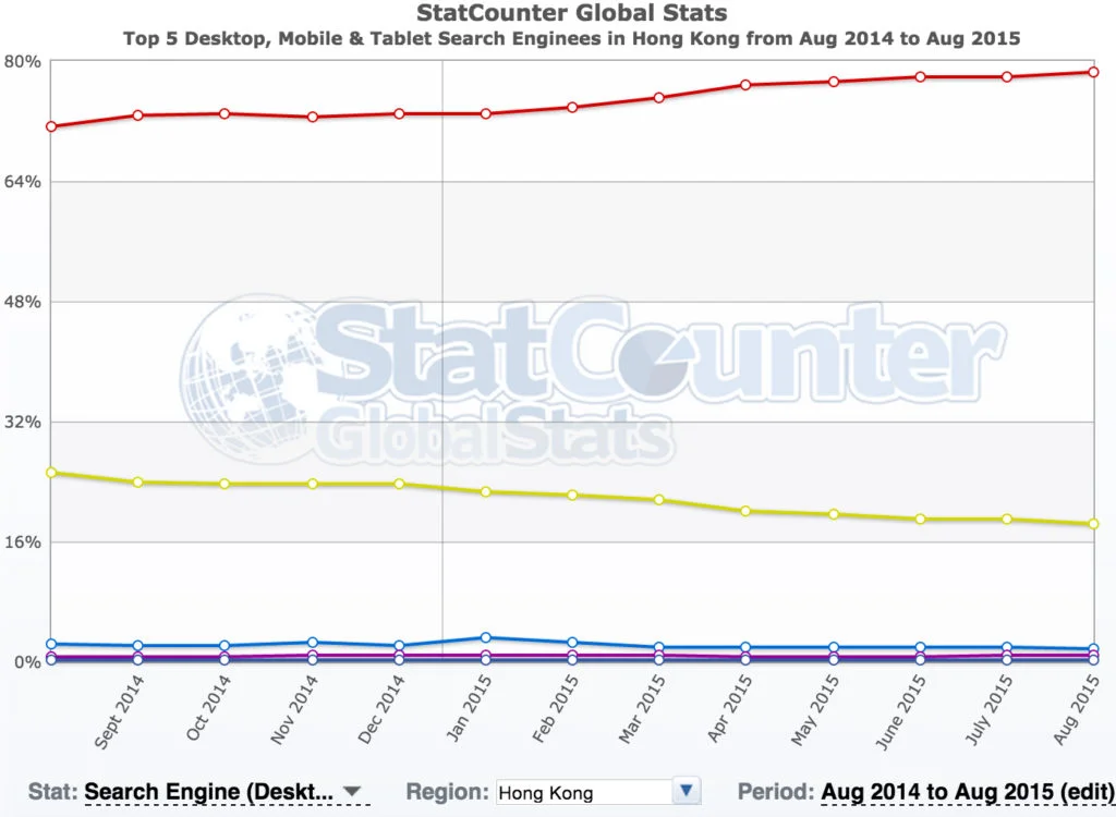 According to StatCounter, Google has close to 79% of the search engine market share in Hong Kong in Aug 2015, while Yahoo has 18.4% search market share. Together, they command 97% of the market share which makes the other search engines irrelevant.