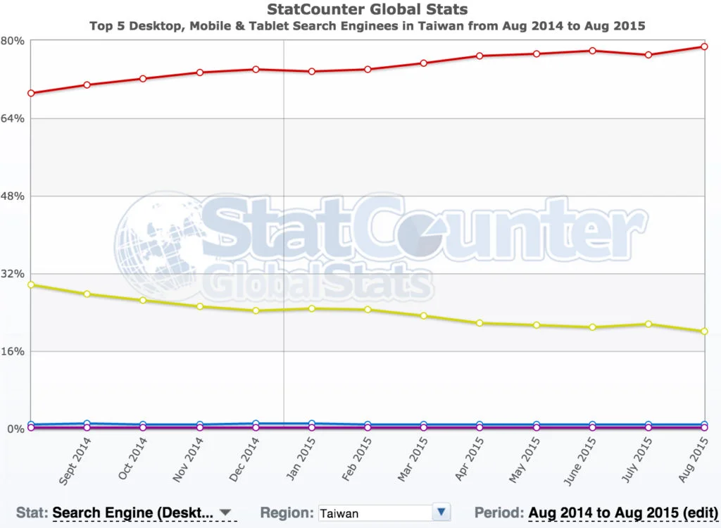 Taiwan market is quite similar to Hong Kong. According to StatCounter again, Google has 79% of the search engine market share in Aug 2015, while Yahoo has 20%. The overall trend over the past 12 months is quite identical to that of Hong Kong actually. A similar recommendation is given when you want to run a SEM campaign in Taiwan.