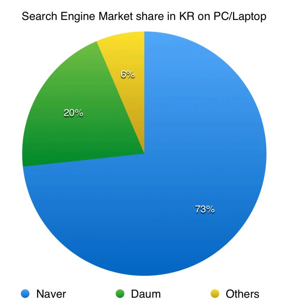 The latest reliable data source that I have is still KoreanClick, a Nielsen company, back in Q2 2013. Naver and Daum still have more than 90% of the search engine market in South Korea.
