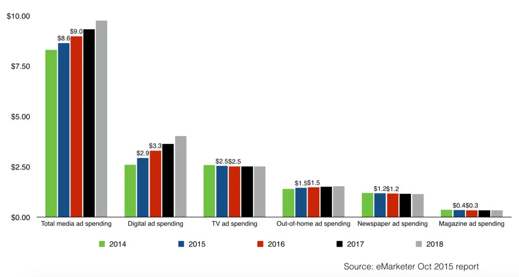 3. Digital ad spending surpassed TV ad spending in 2015 in South Korea ($2.94B, 34% of total media ad spending)
