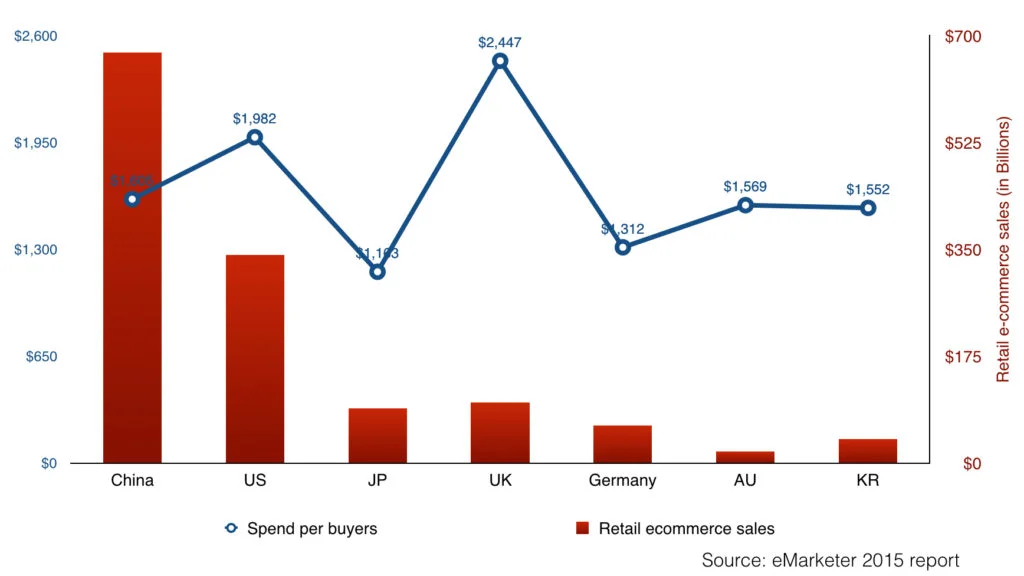 8. South Korea is the 6th largest retail e-commerce market ($38.8B) in the world, while UK digital buyer spends the most online on average ($2,447/year)