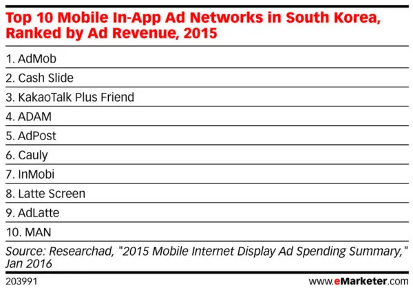 7. Admob, “Cash Slide” and “KakaoTalk Plus Friend” are the top 3 Mobile In-App Ad Networks in South Korea in terms of Ad Revenue