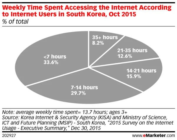 2. Weekly, internet users in South Korea spends about 14 hours online or about 2 hours/day (less than 3 hours/day from Chinese users)