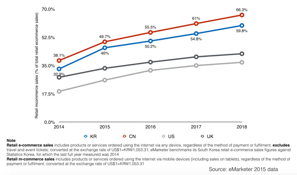 As you could see from the chart above, in 2016, about half of all retail e-commerce sales in KR would happen on mobile devices. This is the highest rate worldwide, behind China only.