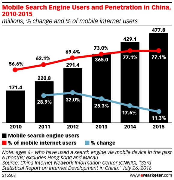 Similar to other countries, many searchers in China are using their mobile phone to search. You may be amazed that the number of mobile search engine users in China is more than 480M.