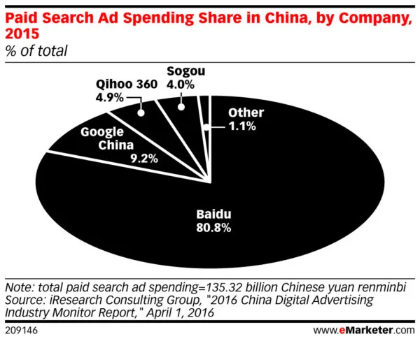 From a revenue point of view though, Baidu has the lion share of the paid search ad spend in China with more than 80%.
