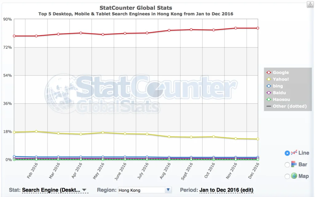 For HK and TW markets, I have to rely on statcounter data, it's fairly accurate that Yahoo! still has about 18-20% share of the market and Google has the rest (around 80%+). This is for Hong Kong: