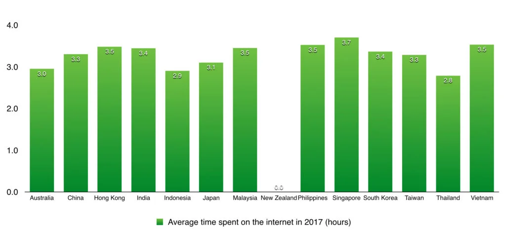 5. Across all countries in APAC, internet users spend about 3 hours online/day