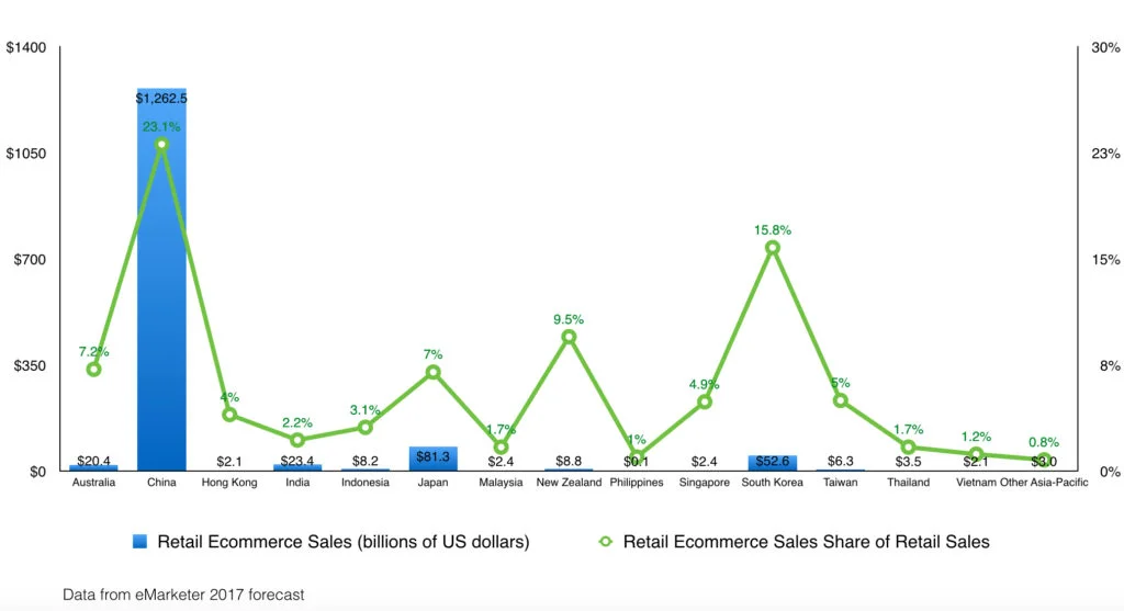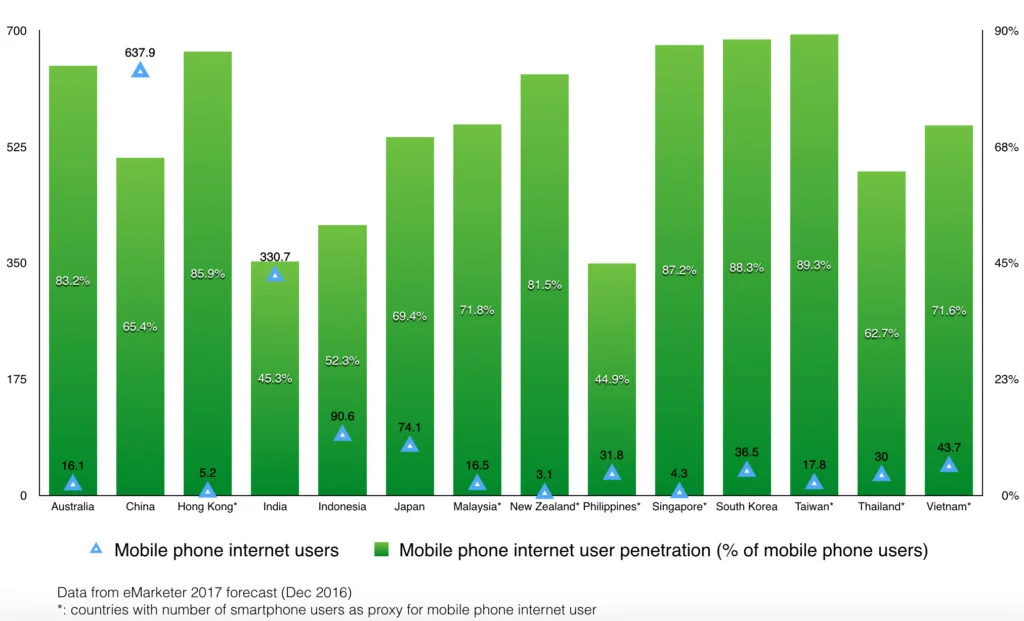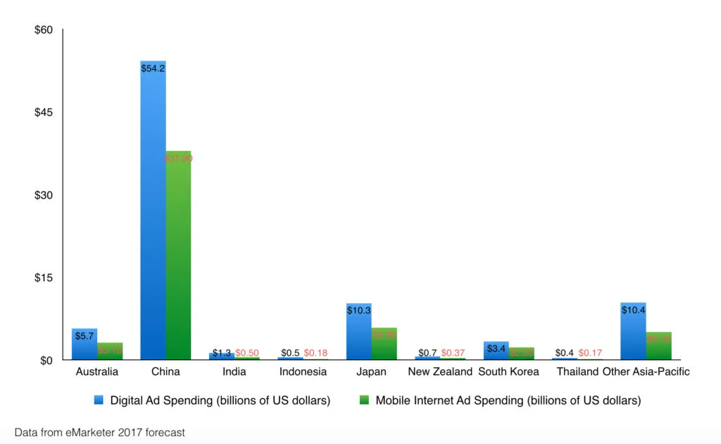 Data from eMarketer 2017 forecast. No suitable data for the rest of APAC countries.