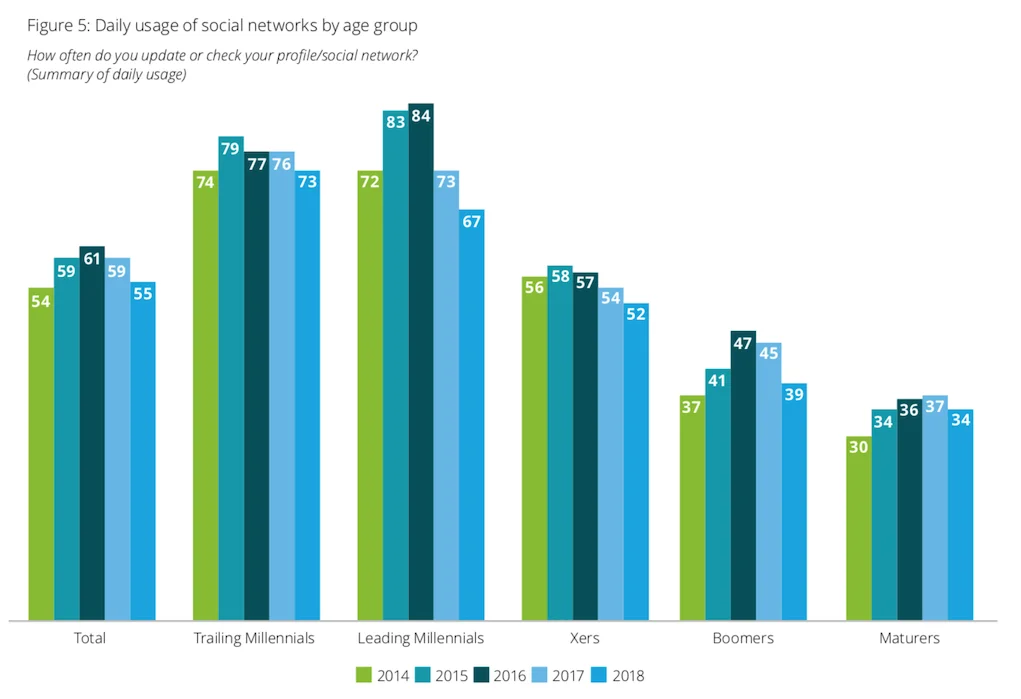 This is perhaps not surprising, given the fact that there is a big decline from 55% to 40% of respondents "who feel time spent interacting with friends on social media is just as valuable as time spent together in-person." (extract from the same report)