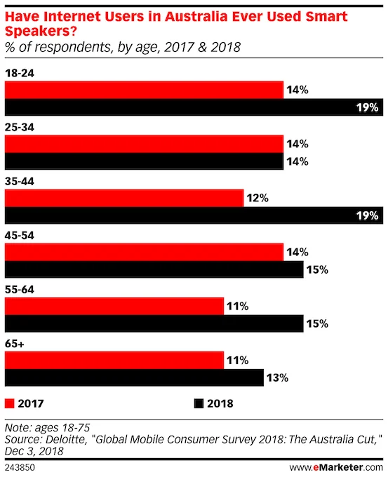 From the above graph, we can see that smart speaker ownership jumped by more than 3X from 2017 to 2018. A larger percentage has tried to use smart speakers but yet to buy them.