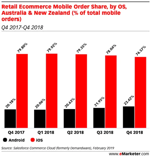 Interestingly, close to 80% of all mobile orders in Australia happen on iPhone and not Android phones, through the trend is slowing.