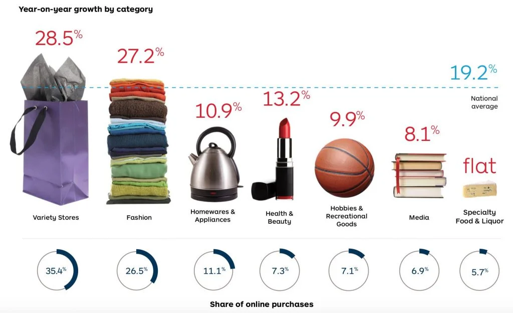 6. Top 3 categories for online purchases in Australia in 2018 are: variety stores, fashion, homewares/appliances