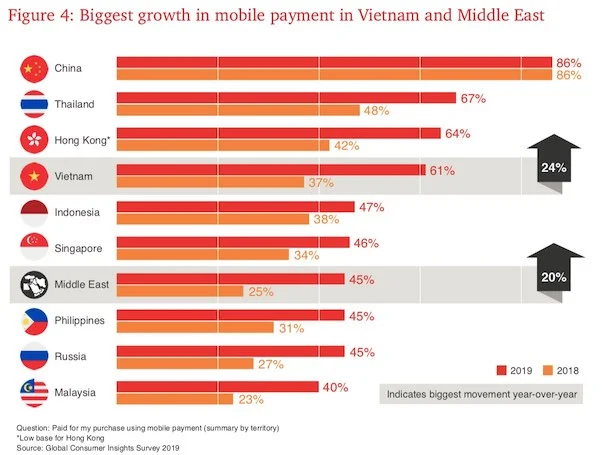This is up from 37% in 2018. It shows enormous progress and investment from mobile payment solution providers in Vietnam. Data is from PWC Global Consumer Insights Survey 2019.