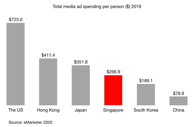 Ad spending per person is reducing marginally over the next few years in Singapore as the total ad spending is expected to be flat and the Singapore population is increasing slightly.