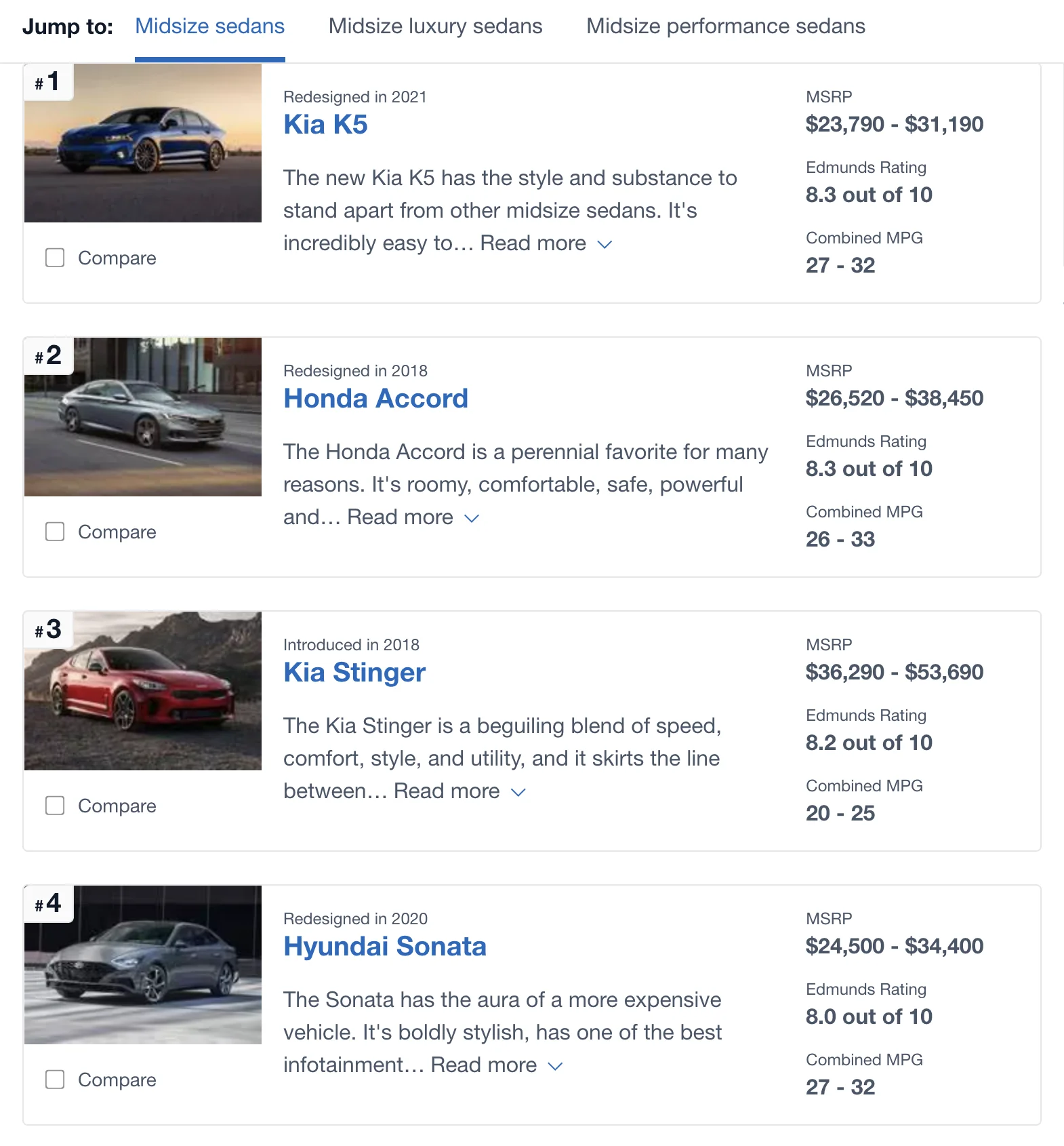 I have no experience with cars in the United States, so I find the best car rankings on Edmunds helpful. These lists allow me to understand what is popular among Americans for different categories, such as SUVs, sedans, and hatchbacks. Additionally, it provides explanations for why these vehicles are liked.