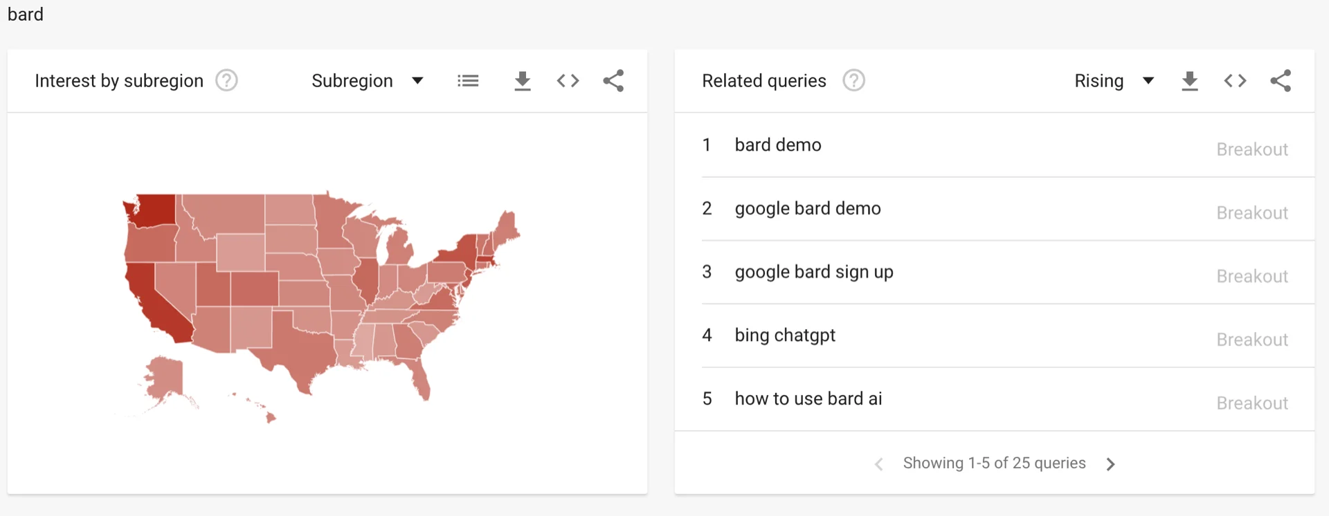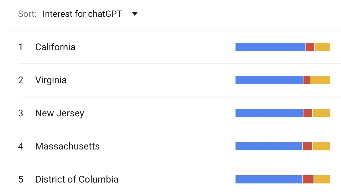 The top five subregions in terms of interest for ChatGPT and Bard are not surprising but Bing’s are. I don’t have a good hypothesis on why West Virginia, Wyoming or Mississippi are the top 3 subregions for Bing. What do you think?