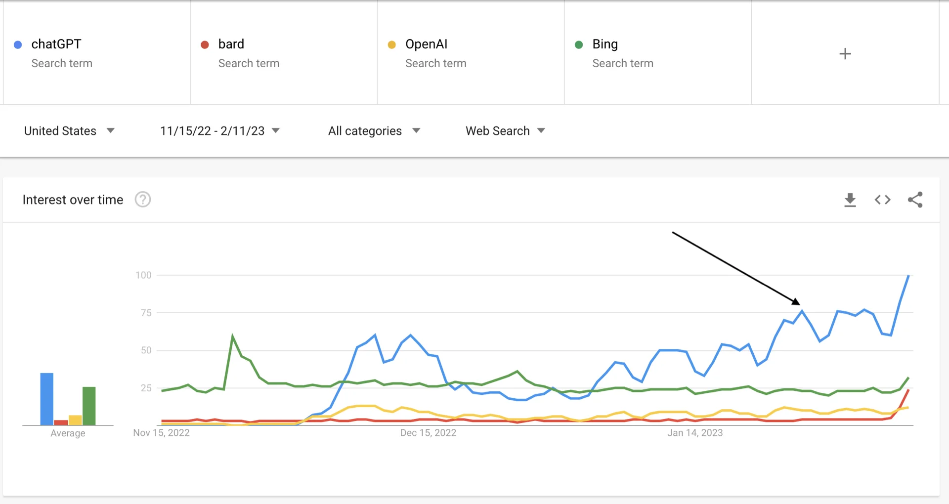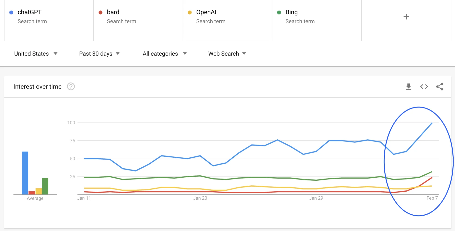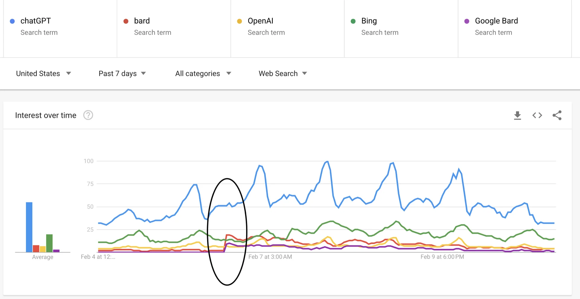 Zooming into the past seven days, this is what you see from Feb 04 until now. There was a big (relative to before) bump for Google bard and a generally increasing interest in Bing.