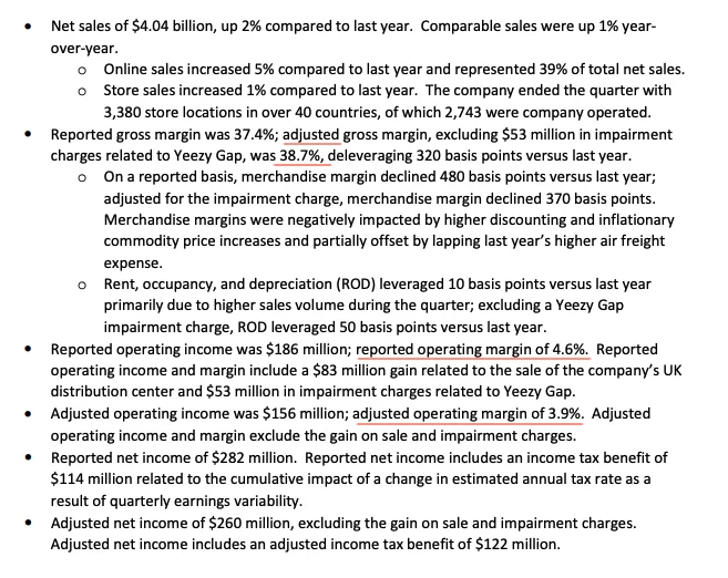 - I took the screenshot below from Gap statement and highlighted the key numbers in red. Dmitri is right, Bing chat made up the numbers like adjusted gross margin, operating margin, etc…