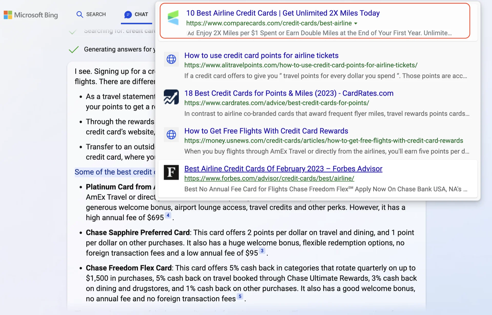 Since I was white-listed for Bing Chat, I have been trying to use it and see if I see any ads. I focus on travel and credit card because, from my working experiences, those verticals often have many search advertisers.