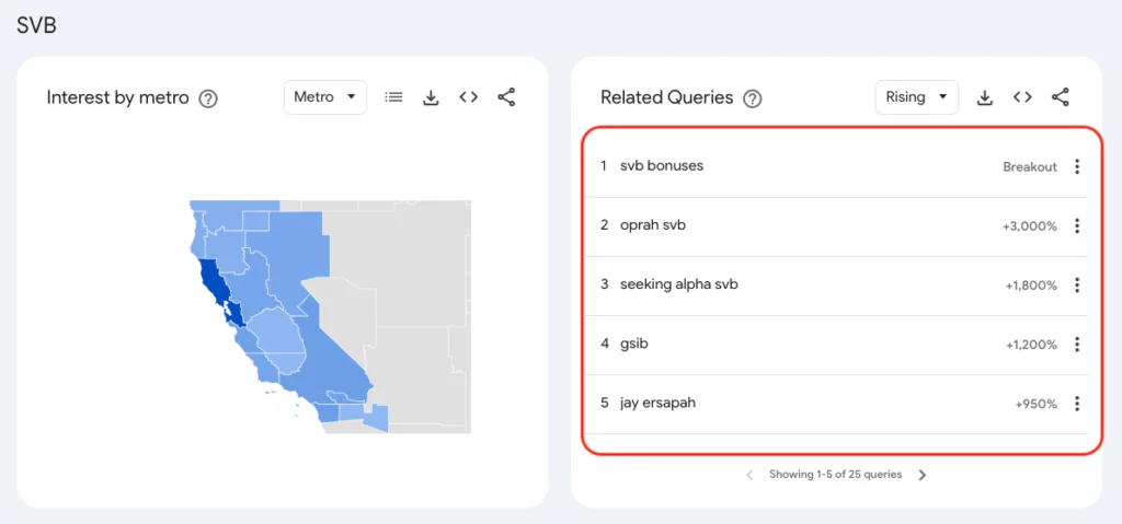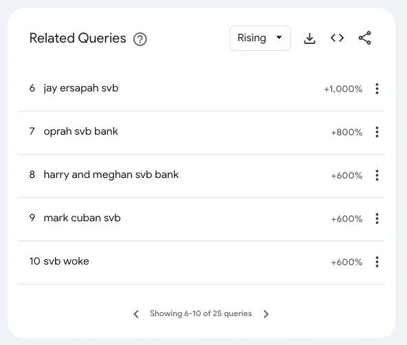 Again this surprised me. Why are people in California searching for news about "Oprah SVB"? From what I can gather online, there seems to be rumours about Oprah keeping a lot of money at SVB bank.