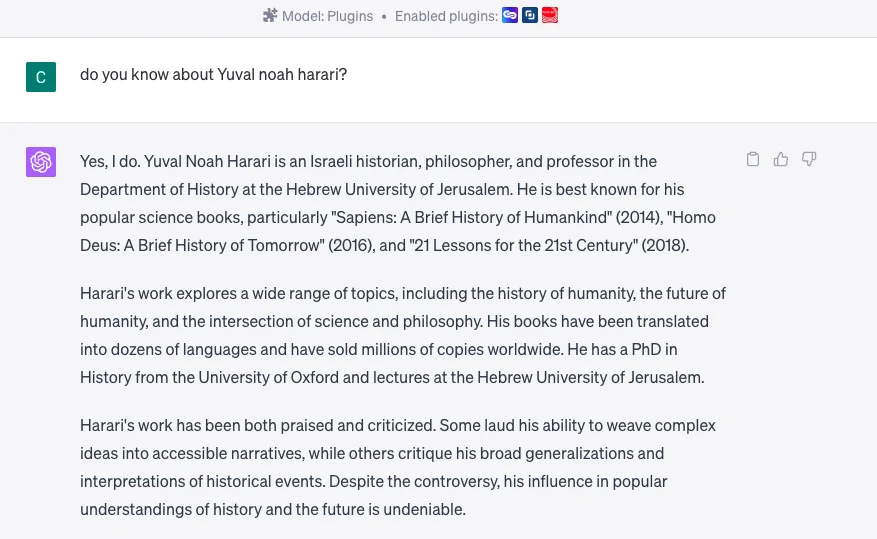 - "Do you know about Yuval Noah Harari?" ChatGPT will give me the answer with a high-level introduction about Yuval.