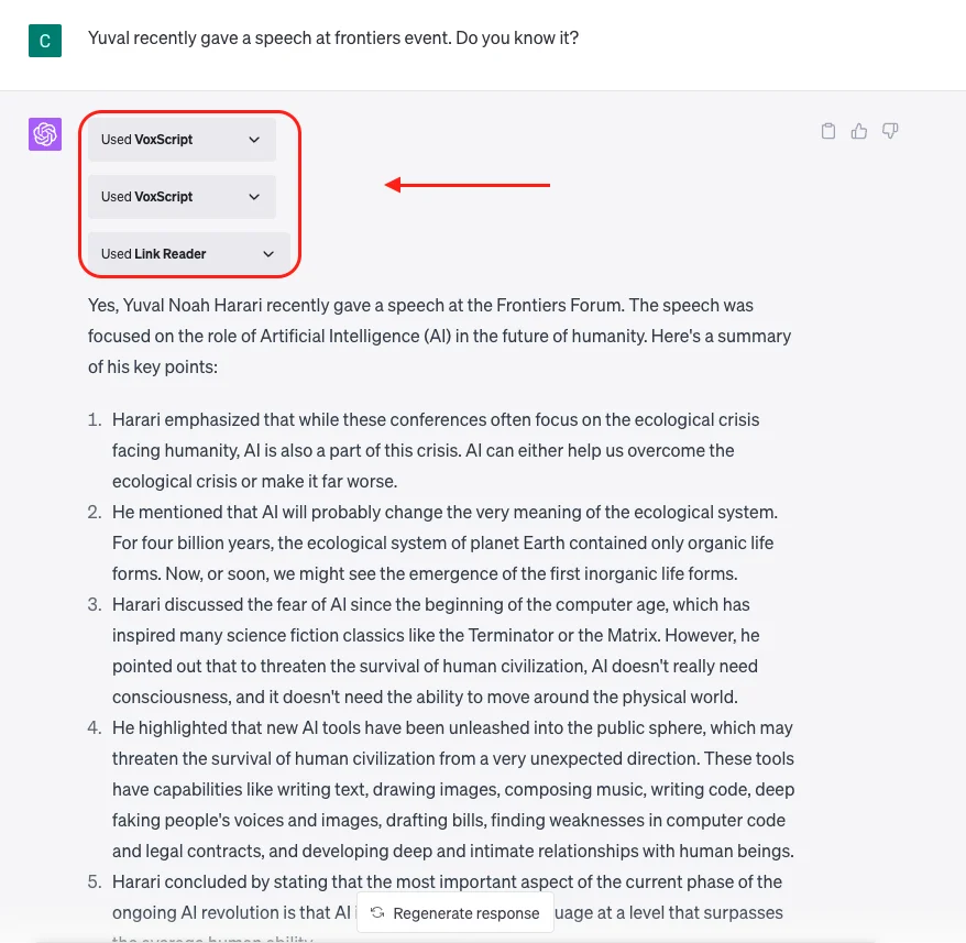 - Previously, without the ability to browse the internet and use plugins, I would not go to chatGPT to learn more about Yuval Harari's latest talk at the Frontiers Forum "AI and the future of humanity".