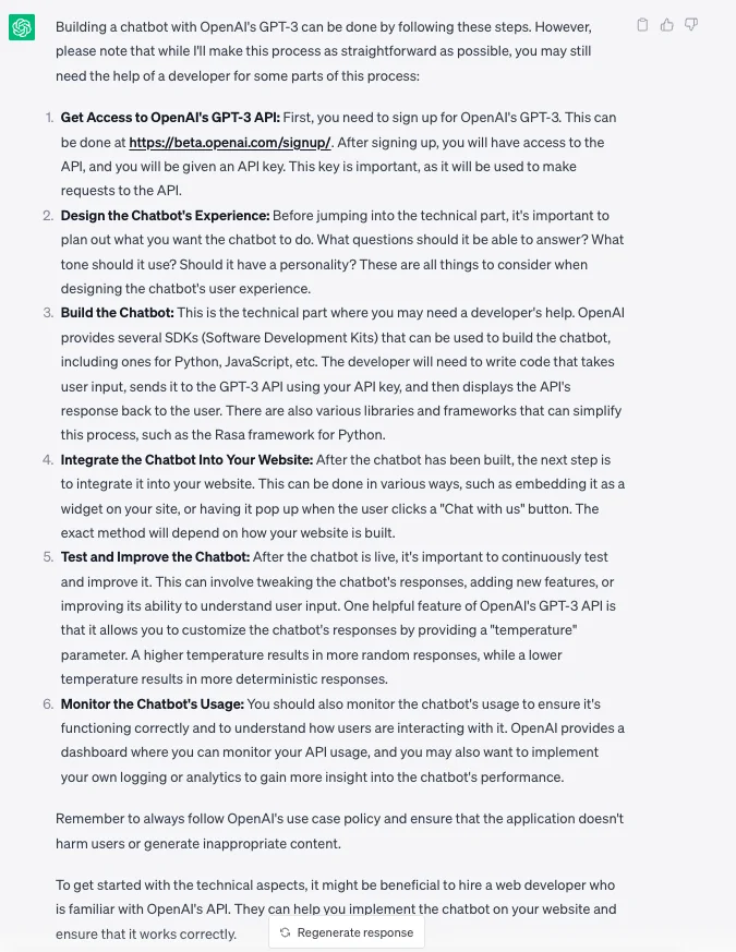 I told chatGPT that I completed step 1 and got the OpenAI API ready. Then it replied with a further breakdown of step 2. The fact that it remembers that I am a newbie and need detailed guidance amazes me.