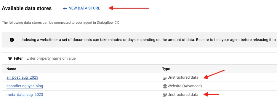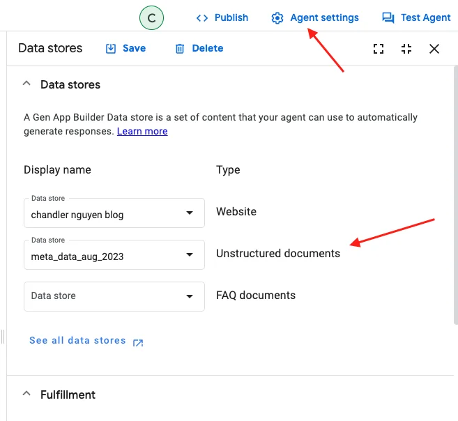 After the data store is created, you can add the new store into the chatbot, under Agent settings